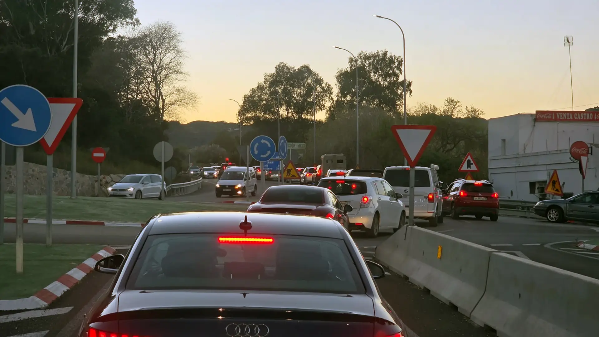 El origen del colapso se encuentra en el cierre de uno de los carriles de la nacional, lo que obliga a dar paso alternativo al tráfico. Esta restricción ha terminado por bloquear el punto crítico donde la N-340 conecta con la vía que conduce hacia Medina Sidonia por Cañada Ancha, dejando imágenes de largas hileras de vehículos detenidos bajo la luz del atardecer.