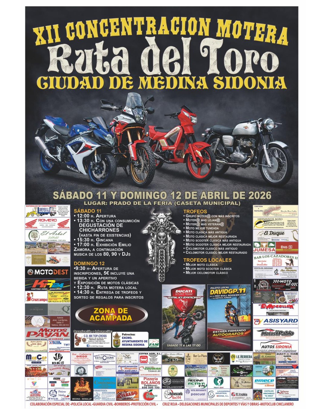 Medina Sidonia se prepara para recibir a cientos de aficionados al motor con la XII Concentración Motera “Ruta del Toro. Ciudad de Medina Sidonia”, que tendrá lugar los días 11 y 12 de abril en la Caseta Municipal del Recinto Ferial. El evento arrancará el sábado a las 12.00 horas y continuará el domingo desde las 10.30 horas, con una programación pensada para amantes de las motos de todas las edades.