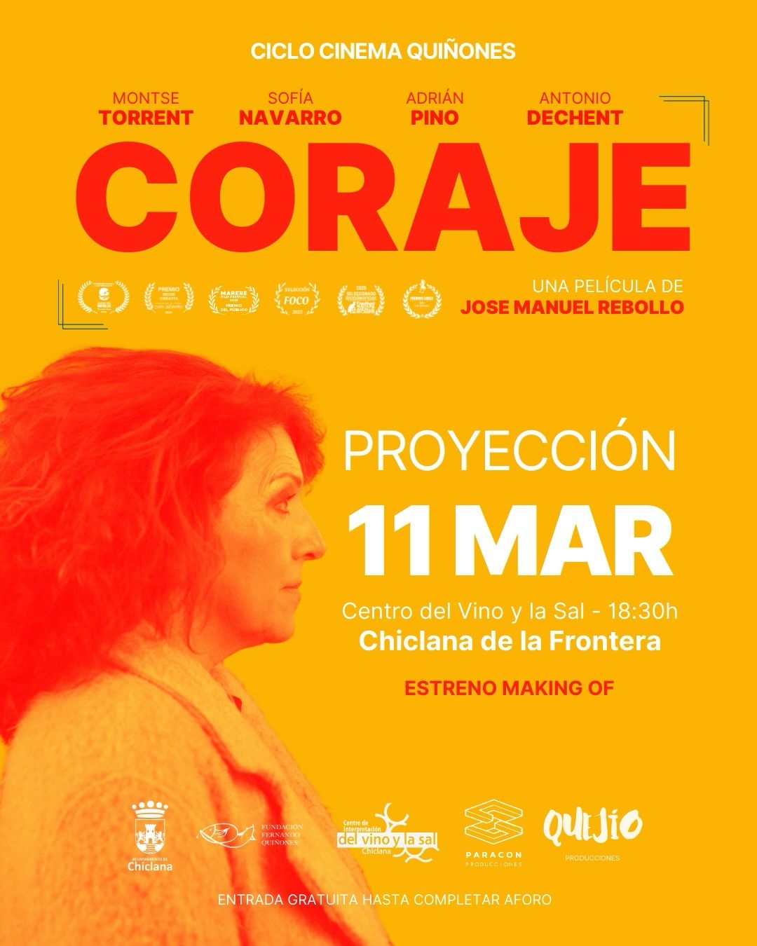 El cineasta portuense José Manuel Rebollo y la actriz Montse Torrent estarán este miércoles 11 de marzo en Chiclana para la proyección de su película Coraje, dentro del ciclo Cinema Quiñones promovido por la Fundación Fernando Quiñones. El evento, que se celebrará a las 18.30 horas en el Centro de Interpretación del Vino y la Sal, incluye un diálogo posterior con el director y la actriz, y el acceso será libre hasta completar aforo.